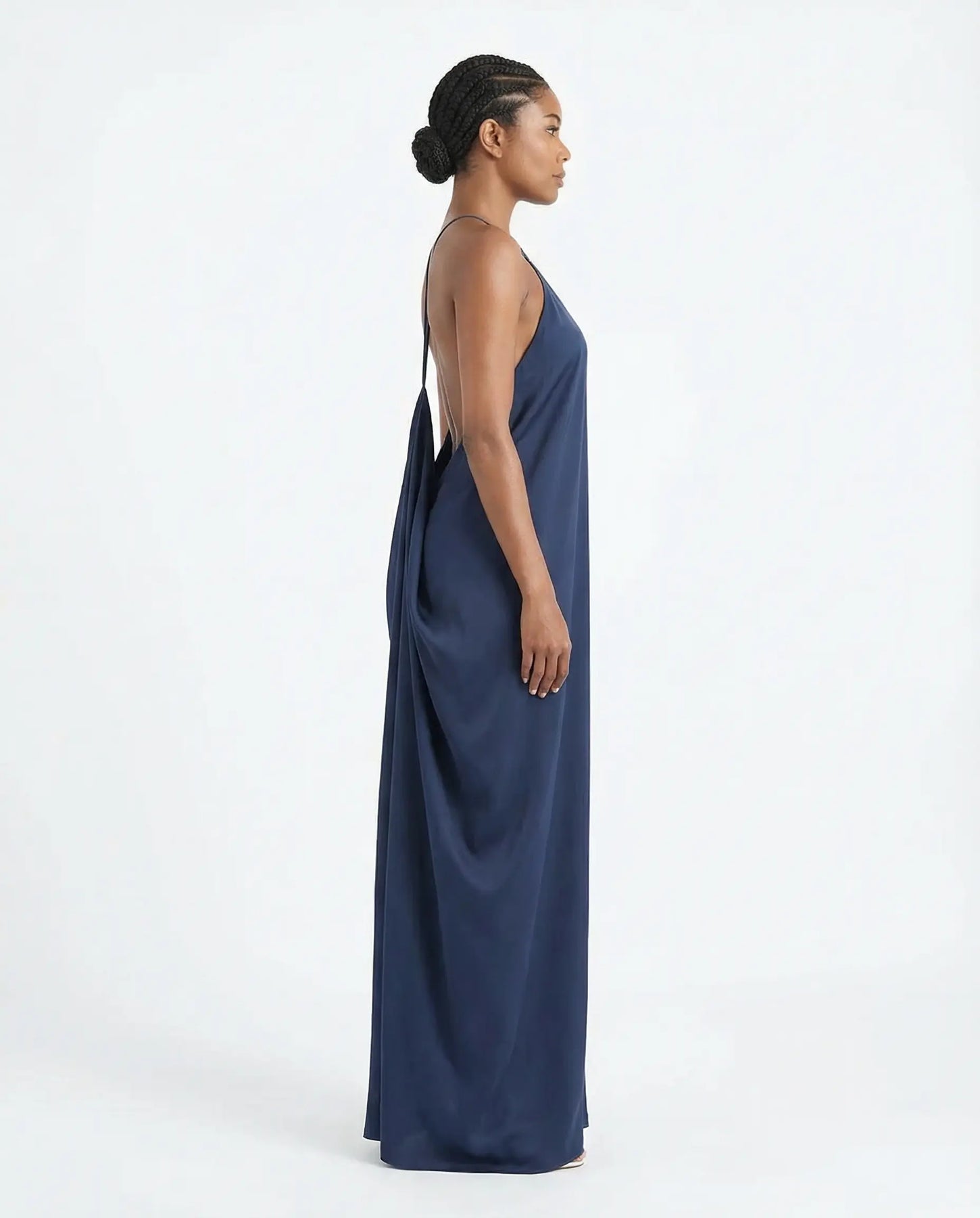 Élise Backless Fluid Maxi Dress is shaped by a clean, elongated silhouette with an open back that creates a quietly striking impression.